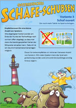 Hierzu benötigt Ihr 2 Exemplare vom Ostfriesischen Schafe-Schubsen. Ihr benötigt aus beiden Spielen alle Steine, alle Kartensätze, 1 Engel, 2 Teufelchen und die 2 Spielpläne aus einem Spiel. Eine Tischseite spielt mit den Schafsköpfen nach oben, die andere Seite mit der Rückseite der Spielsteine nach oben. Auf diese Weise kann man die gleiche Farbe zweimal zugleich verwenden. Jedes Schaf erhält einen Rettungsring. Gespielt wird nach den Original-Regeln. Solange sich mehr als 3 Schafe auf dem Deich befinden, wird mit 2 Teufelchen gespielt, d.h. es verlieren die zwei niedrigsten Zugweiten einen Rettungsring. Ab 3 Spielern wird nur noch ein Teufelchen verteilt.