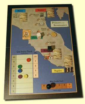 Ablauf: Alles beginnt (wie immer) mit dem Aufbau. Der Spielplan kommt auf den Tisch, alle Stadt-, Truppen- und das Papstplättchen werden nach Farben sortiert daneben ausgelegt. Jeder Spieler wählt eine Familie und erhält zusätzlich 40 Gold sowie 12 Einflusspunkte. Dann wird der Anfangsstatus der Städte auf der Leiste markiert, eine schwarze Spielfigur auf die Anzeigeleiste für geführte Kriege gestellt und die Verräterplättchen verdeckt als Stapel bereit gelegt. Zuletzt gibt es noch die 12 Ereignisplättchen. Sie markieren die drei auszuspielenden Dekaden. Jeweils vier von ihnen werden zu den offenen Plättchen hinzu gelegt.