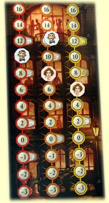 Aktionskarten zu nehmen ist besonders in den ersten Runden eine gute Option, ein Direktverkauf eines Besitztums kann auch sinnvoll sein, oder man wählt direkt den gesellschaftlichen Abstieg. Auf dem politischen Rasen kann man sofort Wählerstimmen verlieren oder sich durch den Erwerb von Plättchen in politische Zirkel einschleichen. Gelingt das, dann wird der Spieler Mitglied zum Beispiel im Zirkel der Köche oder der Bootsbesitzer. Für das Spiel bedeutet das, er hat ein zugehöriges Symbol. Und damit wären wir bei der Taktik. Sechs dieser Symbole gibt es. Sie sind auch zu finden bei den Besitztümern und auf der Skala der gesellschaftlichen Beliebtheit. Es gibt sie ebenfalls bei den Aktionskarten. Damit darf man zum Beispiel zwei Pfund Geld abgeben für jedes Bootssymbol im eigenen Besitz. Die angesprochene Karte heißt mürrischer Kapitän und die nette Illustration nebst den manchmal skurrilen Bezeichnungen gehen leider oft im Eifer des Spiels unter. Wer guckt schon nach der nackten Teilnehmerin beim Sonntagspicknick wenn es darum geht, mit dieser Karte im richtigen Moment den richtigen Marker in der Gesellschaftswertungstafel nach unten zu ziehen. Der Ruf der freizügigen Picknick-Teilnehmerin ist sicher völlig ruiniert, das Ansehen des Spielers sinkt um genau einen Punkt. Das klingt wenig, kann aber wichtig sein, wenn Tante Berta bei Rundenende auftaucht. Wer die Fernsehserie Jeeves and Woster kennt, der kennt auch Aunt Agatha als "nephew crusher": Immer bemüht, den gesellschaftlichen Ruf des unnützen Neffen zu verbessern erschwert sie es jenem, die eigenen Ziele zu verfolgen. Tante Berta geht etwas taktischer vor. Sie wirft einen Blick auf die Tafel des gesellschaftlichen Ansehens mit vier Markern in drei Spalten. Falls diese Marker eine bestimmte Konstellation aufweisen - die ist zu Beginn der Runde bekannt - dann ist Tante Berta erfolgreich, verbessert die Reputation und verschlechtert die Siegeschancen.