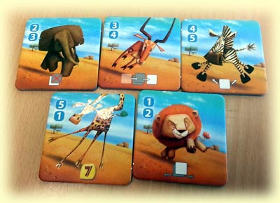 Jeder Spieler hat ein Team aus fünf Tieren: Löwe, Zebra, Elefant, Giraffe und Antilope. Auf jedem der Tiere sind zwei Zahlen abgebildet, die bei allen Spielern gleich sind.