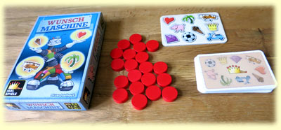 Das Spiel Wunschmaschine besteht aus 33 Wunschkarten, zwanzig roten Wunschtalern sowie einer Übersichtstafel, die alle neun Wünsche zeigt.