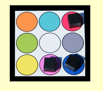 Hinter meinem Sichtschirm habe ich eine kleine Markierungstafel und passende Steine. Die Tafel zeigt 9 farbige Punkte, deren Position mit denen übereinstimmt, die den Gegenständen und Tieren auf der Aufgabenkarte zugeordnet sind. Habe ich etwas auf der Schattenkarte entdeckt, markiere ich den korrespondierenden Farbpunkt auf meiner Tafel. Bin ich der Meinung, alle vorhandenen Dinge entdeckt zu haben, schnappe ich mir den höchsten Bonusstein aus der Mitte, der noch verfügbar ist. Wird der letzte Stein genommen, endet die laufende Spielrunde.