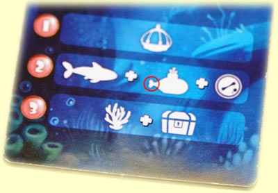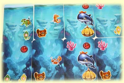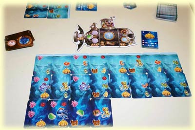 Auf das Spiel übertragen legen wir im Laufe des Spiels 3 Kartenreihen aus, eine Reihe in jedem Durchgang. Für jeden Durchgang gibt es dafür einen eigenen Kartensatz. Auf diesen "Erforschungskarten" können mehrere verschiedene Sachen abgebildet sein: Fische, Korallen, Schatztruhen, Kristalle und Tauchstationen sowie Krakenaugen.