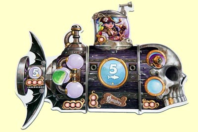 Die Grundfähigkeiten jedes U-Boots sind ja anfangs gelinde gesagt bescheiden. Im Aquarium haben maximal 3 Fische Platz, der Antrieb sorgt für keine zusätzlichen Punkte, das Cockpit weist lediglich ein Periskop auf, sodass man nur 2 Karten zur Auswahl hat, der Motor verfügt bloß über 1 Treibstoff, weshalb pro Durchgang nur eine Karte zusätzlich ausgespielt werden darf, und mit einer Luftschleuse kann auch nur ein einziger Taucher abgelassen werden.
