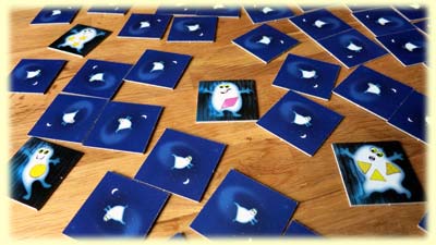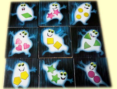 Alle diese Kärtchen müssen verdeckt ausgelegt werden. Der Spielablauf ist sehr einfach: Ein Geisterkärtchen wird aufgedeckt und bleibt aufgedeckt. Ab der zweiten Runde müssen alle Mitspieler schauen, ob ein anderes schon aufgedecktes Plättchen Stoffflicken in der gleichen Form aufgenäht hat.