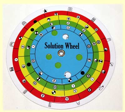 Dazu brauchen wir stets einen vierstelligen Code - für jede Farbe eines von 12 Symbolen -, welchen wir auf dem "Solution Wheel" einstellen. Ist es die richtige Kombination, erscheint das Symbol des Gegenstandes in zwei Aussparungen des Lösungsrades, und wir sind berechtigt, diesen Umschlag zu öffnen.