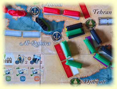 Im Spiel fühlt man sich davon allerdings eher selbst ziemlich gekniffen. Das hat zwei wesentliche Gründe: Durch die zwei unterschiedlichen Streckentypen ist man anders als in anderen Zug um Zug-Spielen viel mehr auf bestimmte Karten angewiesen. Man kann nicht einfach am Anfang wahllos Waggons sammeln und dann den besten Weg bauen, sondern muss wesentlich gezielter sammeln, da eine verbaute Schiffstrecke einen plötzlich zum Umweg über Eisenbahnen zwingt und umgekehrt. Dann hat man plötzlich die ganze Hand voller Karten, die man nicht brauchen kann.