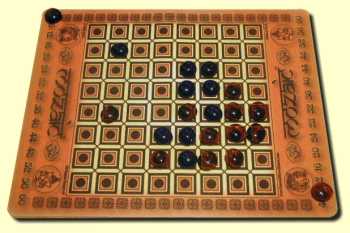 Das Spielmaterial befindet sich in einem durchsichtigen Plastikbeutel und hält neben dem stoffüberzogenen Spielplan aus Kunststoff einen Stoffbeutel mit den Spielsteinen bereit. Leider lassen sich die beiden Spielerfarben wegen des dunklen Glases der Steine nur schwer unterscheiden. Auch der Onyx kann leicht mit einer Spielerfarbe verwechselt werden. Die Spielregel ist klar verständlich und bietet überdies auf der Rückseite Hintergrundinformationen, die die Herkunft des Spiels aus Indien beleuchten soll.