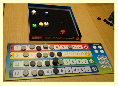 Die Grundregeln des Ursprungsspiels Qwixx wurden bei Qwixx - Das Duell weitestgehend übernommen und werden hier nicht noch einmal in jedem Detail wiedergeben. Wer am Zug ist, würfelt zwei weiße und vier farbige Würfel und entscheidet danach, welche bis zu zwei Zahlenkombinationen genutzt werden sollen. Diese Zahlen werden auf dem gemeinsam genutzten Spielbrett von links nach rechts mit einem Holzchips der eigenen Farbe belegt, wobei man sich bei der Reihenfolge nur an den eigenen Chips orientiert. Es dürfen allerdings nur freie Felder belegt werden, d.h. auch die vom Gegenspieler belegten Felder sind tabu.