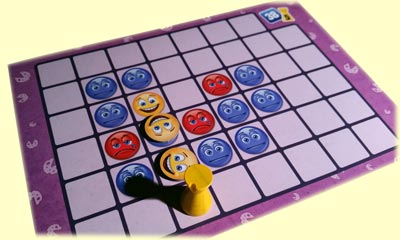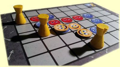Um die traurigen Gesichter in eine bessere Stimmung zu versetzen, platziert man zunächst eine Spielfigur auf einem freien Feld. Ausgehend von dieser Figur prüft man nun in alle Richtungen (waagerecht, senkrecht und diagonal), ob sich zwischen der gerade gesetzten Figur und einem gelben Smiley oder einer anderen Figur unglückliche Gesichter, aber keine leeren Felder befinden. Ist dies der Fall, werden die blauen Gesichter mit einem gelben Smiley abgedeckt und die roten mit einem blauen Plättchen.
