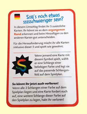 Der untere Kartenteil betrifft die Schlangen; entweder muss man eine bestimmte, eine beliebige oder alle Schlangen einer Farbe ziehen, oder es wird eine neue Schlange auf den Spielplan gebracht, oder - die negativste Auswirkung - eine beliebige oder auch alle Schlangen einer Farbe werden zur nächsten Leiter gezogen.