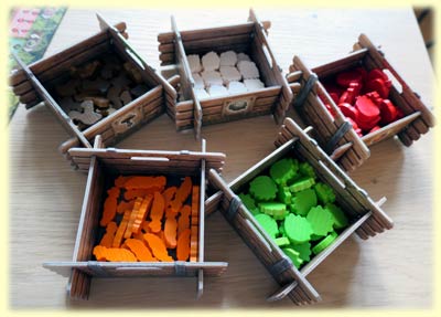 Als Erstes fällt das ansprechende Spielmaterial auf. Selbst das Untertteil des Spielkartons ist schön illustriert. Das Spielbrett und insbesondere die Servicekarten sind sehr schön, teilweise auch humorvoll illustriert. Die Waren, das Gemüse, sind aus bunt lackierten Holz, und passend dazu gibt es zusammensteckbare Pappkisten. Diese Pappkisten passen auch zusammengesteckt in den Karton, praktisch zum Auf- und Abbauen. Etwas wackelige Kandidaten sind aber die Hofbewirtschafter in Form von kleinen Flaschen, na ja - ist ja auch ein bisschen witzig, insbesondere wenn sie mal umfallen sollten. Da wäre mehr Standfestigkeit wünschenswert gewesen.