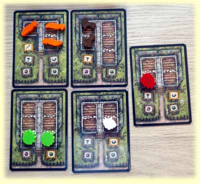So sollte auch gut überlegt werden, ob man ein Gewächshaus mit wenigen oder vielen Parzellen erwirbt. Wird in einem 3er-Gewächshaus ausgesät, erhält man nur 2 Gemüse aus dem allgemeinen Vorrat, bei der Aussaat in einem 6er-Gewächshaus immerhin 5. Allerdings muss das 6er-Gewächshaus auch 6-mal abgeerntet werden, bevor in ihm neu ausgesät werden kann. Da muss auf jeden Fall auf Ernteaktionen auf dem Spielbrett zurückgegriffen werden, und die Arbeitskraft kann nicht für andere Aktionen eingesetzt werden.