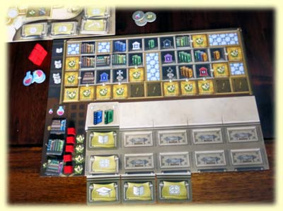 Mir gefällt der variable Aufbau, der jede Partie zu einer neuen Herausforderung gestaltet, und auf diese Weise den Wiederspielreiz hoch hält. Zwar dauert es ein wenig, bis man alle Plättchen auf den Spielplänen verteilt hat (die unterschiedlichen Formen sind dabei hilfreich, die richtigen Positionen zu finden), aber das Resultat ist auf jeden Fall die Mühe wert. Jedes Spiel verläuft anders, und es kommt darauf an, die Auslage gut zu analysieren und sich - zusammen mit seinem Startschreibtisch und den Meisterbriefen - eine taktische Vorgehensweise zurecht zu legen.