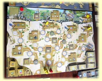 Der Teufel steckt im Detail, in diesem Fall in der Verzahnung der einzelnen Elemente. Da gibt es dann schon recht viele Überlegungen anzustellen. So muss man beispielsweise beim Reisen für einige Wegstrecken die erforderlichen Kosten bezahlen können. Aber selbst wenn man über ausreichend finanzielle Mittel verfügt und somit seinen Gelehrten gleich über mehrere Felder ziehen könnte, macht einem die verflixte Regel, dass man bloß jenes Feld markieren darf, auf dem man seine Bewegung beendet, einen Strich durch die Rechnung. Ein richtiges Dilemma, welchem man ebenfalls auf dem Technologiebaum begegnet.