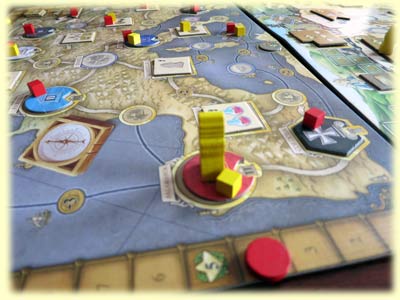 Und schließlich können wir mit der Aktion "Studieren" unser Wissen vermehren. Dies wird durch das Füllen von Bücherregalen veranschaulicht. Die Anzahl der "Bücher"-Symbole gibt vor, in welche Reihe wir eines unserer Regalplättchen platzieren dürfen. Allerdings müssen wir gleichzeitig die Voraussetzung für das beabsichtigte Feld erfüllen, also die entsprechenden Orte in Europa besucht haben, oder die passenden Folianten auf unseren ausgespielten Aktionskarten vorweisen können.