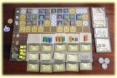 Die anderen 3 Aktionen dienen eher als Mittel zum Zweck. Arbeiten verschafft einem das nötige Kleingeld, um sich vor allem Zusatzaktionen leisten zu können. Diese braucht man, um - durch Tränke - notfalls fehlende Folianten ersetzen oder im Extremfall gleich eine ganze Bedingung eines Buchfelds ignorieren zu können. Reisen ist für sinnvolles Studieren unumgänglich. Und Lehrstunden muss man ohnehin von Zeit zu Zeit einlegen, weil man ja pro Runde 1 Karte unter den Schreibtisch schieben muss und auf diese Weise Handkarten verliert. Die neu erstandenen Aktionskarten haben dafür bessere Sondereffekte.