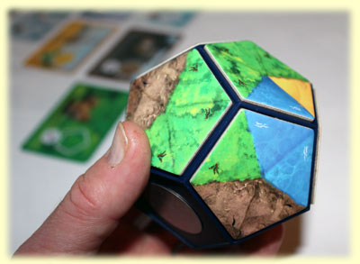 Genau dafür stellen sich die dreidimensionalen Planeten als größtes Hindernis heraus. Es ist schon mit seinem eigenen Planeten schwierig genug zu erkennen, wie viele Gebiete bzw. Landschaftsfelder man von einem bestimmten Lebensraum besitzt, besonders weil es in den meisten Fällen ja noch eine zweite Bedingung zu überprüfen gilt. Den Überblick über die Situation bei allen Mitspielern zu haben, ist praktisch unmöglich. Der Dodekaeder steht sich hierbei selbst im Weg, weil er die notwendige Übersicht verhindert.