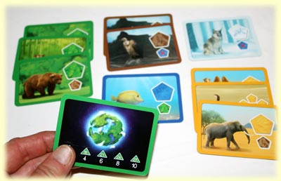 3. Die Natur sorgt dafür, dass die Tiere anschließend jenen Planeten bevölkern, der ihnen den besten Lebensraum bietet. Ab der dritten Runde liegen Tierkarten aus, welche bestimmte Voraussetzungen erfordern. So siedelt sich beispielsweise der Panda nur auf jenem Planeten an, der die meisten Waldgebiete - Ansammlungen von miteinander verbundenen Landschaften - besitzt. Andere Tierarten verlangen das größte Gebiet eines bestimmten Lebensraum, das an einen bestimmten anderen Lebensraum angrenzt, wieder andere im Gegenteil das größte Gebiet, das nicht an einen bestimmten Lebensraum angrenzt. Wer die geforderten Bedingungen am besten erfüllt, darf sich die entsprechende Tierkarte nehmen.