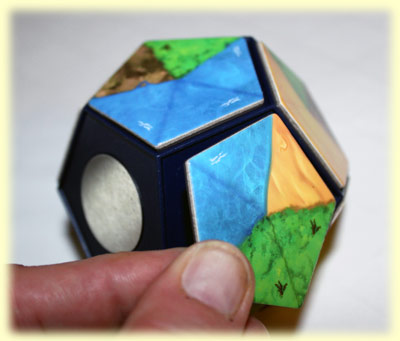 Das Auffälligste an Planet sind die Dodekaeder. Die Kantenlänge der 12 Fünfecke misst 3,5 cm, womit der gesamte Körper immerhin rund 9 cm Durchmesser aufweist. Der Würfel liegt daher sehr gut in der Hand, kann problemlos gedreht werden und sorgt somit für haptisches Vergnügen.