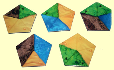 2. Die Entwicklung eines Planeten geht über 12 Epochen (hier Runden genannt), in denen jeweils 1 Fünfeck mit Landschaften bedeckt wird. Dazu dienen die Kontinentplättchen, die jeweils aus fünf Landschaften bestehen. Jedes Plättchen weist dabei zwei oder drei verschiedene von folgenden möglichen Lebensräumen auf: Ozeane, Wälder, Wüsten, Gletscher und Gebirge. In Zugreihenfolge nehmen sich die Spieler je eines von fünf offen ausliegenden Kontinentplättchen und platzieren dieses auf einen freien Platz ihres Planeten.