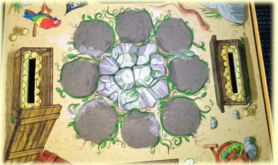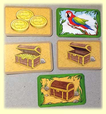 Liegen dort acht böse Taler, ist die Runde zu Ende, und jeder zählt seine goldenen Münzen. Wer hat die wenigsten? Dem hilft der Piratenpapagei in Form von zwei Karten, die jeweils 1 bis 3 Goldmünzen zusätzlich bringen können. Und jetzt schauen alle, wie die Rangfolge der Münzen ist. Der mit den wenigsten Münzen darf eine Schatztruhenkarte ziehen, der nächste zwei, dann drei und so weiter. Dann kommen alle Münzen wieder in den Beutel, und es geht in die nächste Runde.