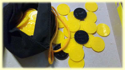 Jetzt greift jeder nacheinander in den Beutel und holt so viele Münzen raus, wie er möchte. Sind alles Goldmünzen? Super, dann ab damit in den Spardosenschlitz auf der eigenen Spielplanseite. Sind eine oder mehrere schwarzen Münzen dabei? Mist, dann lacht sich Captain Black höhnisch ins Fäustchen. Alle Münzen müssen zurück in den Sack, und eine schwarze Münze wird in die Spielplanmitte gelegt.