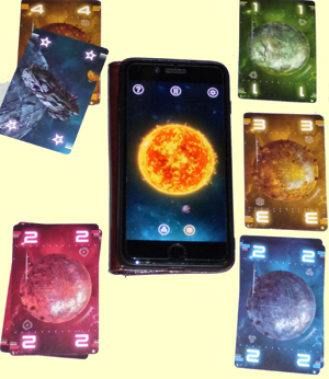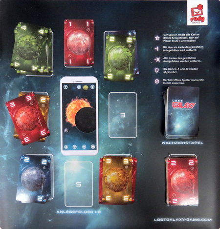 Ereigniskarten und App-Aktionen bringen etwas Abwechslung ins Spiel, die sich aber im sehr herkömmlichen Bereich bewegt. Da gibt es Aussetz-Karten, auch Eigenschaften, mit der man dem Gegner Karten klauen darf. Das ist eher altmodischer Kartenquatsch, der in modernen Kartenspielen nichts mehr zu suchen hat. Die App-Unterhaltung hält sich auch in Grenzen, die musikalische Untermalung wird meist schnell abgestellt, ansonsten ändert sich von Zeit zu Zeit die Zugrichtung und eine Sonnenfinsternis verhindert die Evakuierung. Ganz witzig ist ein immer einmal wiederauftauchender Sputnik in den Spielerfarben. Drückt der entsprechende Spieler auf das Raumfahrzeug, bekommt er zwei Karten zur Belohnung. Gespielt wird bis zur Sonnenexplosion, dann erfolgt die Wertung wie oben schon erläutert. In die App können die Ergebnisse eingegeben werden, gespielt werden sollten mindestens drei Runden.