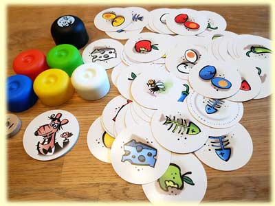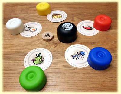 In der Vorspeisen-Variante für Einsteiger ist alles noch relativ einfach: Wer an der Reihe ist, deckt eine Karte auf. Nun müssen alle die Servierglocke, die sich auf der gesuchten Sache (Speise oder Fliege) befindet, schnappen - unabhängig davon, welche Farbe diese hat.