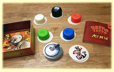 In Ratto Zakko gibt es fünf Servierteller - je einen mit grünem Apfel, weißen Eiern, gelbem Käse, blauem Fisch und roter Chili. Dazu passend gibt es jeweils eine farbige Servierglocke sowie mehrere Speisekarten, die diese fünf Speisen aber auch in anderen Farben zeigen können. Hinzu kommt ein Fliegenchip aus Holz, der unter die blaue Glocke und somit auf den blauen Fisch gelegt wird, einige Fliegenkarten im Design der Speisekarten sowie ein größerer Ratto Zakko-Becher, der zu Beginn über die gelbe Servierglocke gestülpt wird und diese so verdeckt.
