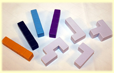 In jedem Durchgang erhalten die Spieler einen eigenen Satz aus Steinen und Schneeblöcken, bestehend aus vier geraden Steinen in den vier verschiedenen Farben, sowie vier weißen Schneeblöcken in verschiedenen Formen.