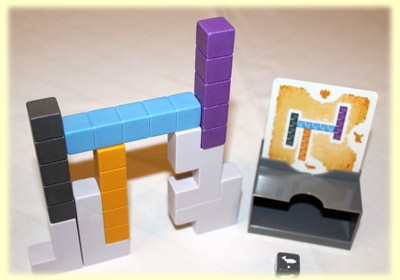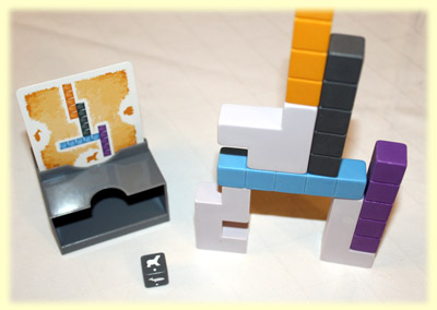 Ungewöhnlich und auch extrem gewöhnungsbedürftig ist die Tatsache, dass mit dem beigestellten Spielmaterial höchstens 3 Spieler gleichzeitig agieren können. In Vollbesetzung übernimmt der vierte Spieler die Rolle des "Scouts", dessen Aufgabe es ist, zu würfeln, die Tukilik-Karte richtig anzubringen und die korrekte Ausführung der fertiggestellten Tukiliit zu kontrollieren. Ich kann mir diese knapp bemessene Ausstattung nur mit den Kosten für die haptisch passenden, aber relativ aufwändig produzierten Spielsteine erklären. Trotzdem finde ich diese Vorgehensweise leicht irritierend und keineswegs nachahmenswert.
