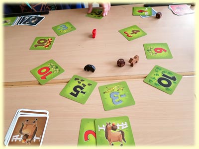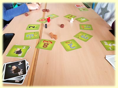 Wenn jeder seine Holzspielfigur neben seine Wegkarte gestellt hat, kann So ein Mist starten: Der aktive Spieler muss mit einem der fünf Würfel würfeln und entscheiden, ob er entsprechend der Augenzahl im Uhrzeigersinn ziehen möchte. Tut er dass, muss er die dort liegende Karte unter seinen Wertungsstapel schieben und eine Karte von seinem Nachziehstapel in die Lücke legen. Steht allerdings schon ein anderes Tier bei der Karte, so erhält dieses die Karte und man ersetzt nur die Lücke. Möchte ich die Karte nicht haben bzw. nicht meinem Mitspieler gönnen, kann ich erneut würfeln und versuchen, ein anderes Feld zu erreichen. Wenn ich allerdings eine Zahl zum 2. Mal oder aber den 5. Würfel würfele, dann muss ich mich bewegen.
