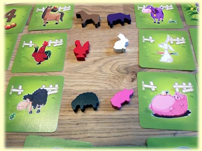 Ansonsten gibt es oft auch Bemerkungen zu den Ausscheidungen des eigenen Tieres und die bíldliche Vorstellung, dort "hineinzutreten" gefällt meist niemandem. Daher spielt bei So ein Mist die Schadenfreude ordentlich mit, wenn durch Würfelpech nun doch auf der "falschen" Karte gelandet wird. Die Möglichkeit, mit 5 Würfeln würfeln zu dürfen, erscheint anfangs toll. Oft macht sich aber Frustration breit - zum Beispiel wenn man merkt, dass nur eins der sechs möglichen Würfelergebnisse zu einer postiven Wertungskarte führt - die Wahrscheinlichkeit, gerade dorthin zu gelangen, ist dann verschwindend klein. Aber das ist ja das Schöne oder aber auch Gemeine - die Würfel sind unberechenbar! Da freut man sich, wenn der Gegner trotz 5 schöner Möglichkeiten nun doch in das Häufchen tritt, und das auch nur, weil er gleich zweimal die einzig blöde Zahl geworfen hat - GRINS. Umgekehrt kann ich mich freuen, wenn ich zu einem Mitspieler gelange, der gerade vor einer riesigen Hinterlassenschaft steht, denn nun sorge ich dafür, dass er sie nehmen muss - DOPPELGRINS. Oft stehe ich vor der schwierigen Entscheidung, ob ich mich mit dem schlechteren Futter zufrieden gebe, wenn doch auch das tollere in greifbarer Nähe ist ... mhhh ... vielleicht doch lieber, denn schließlich könnte ich auch auf das Feld mit dem Mist gelangen.