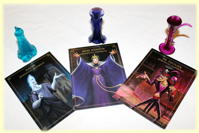 Auch das Spielmaterial fügt sich nahtlos ein. Die Schachtel ist etwas kleiner ausgefallen, was aufgrund der geringeren Anzahl an Schurken logisch und verständlich ist. Wieder sind die Spielfiguren außergewöhnlich stylisch gestaltet, wenn auch die Figur von Dr. Facilier recht leicht umfällt.