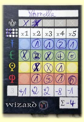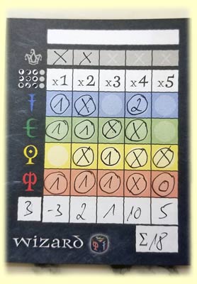Am interessantesten ist noch die Narrenwertung, mit der man sich wenigstens ein bisschen retten kann. Aber auch hier: Fallen keine Narren, gibt es auch keine Narrenwertung. Das Wizard Würfelspiel kann durchaus positive Emotionen am Tisch hervorrufen, unglaubliche Ergebnisse, mit denen man nicht mehr gerechnet hätte. Aber diese Spannung wird immer wieder gedämpft von dem Gefühl, dass man eben absolut nichts in der Hand hat. Man kann versuchen, schlau zu spielen, man kann versuchen, sich dem Glück zu ergeben ... beides kann zu einem Ergebnis von -4 oder +24 Punkten führen. Deshalb sticht das Wizard Würfelspiel nicht aus dem Angebot anderer Würfelspiele heraus. Obwohl man mit dem großen Bruder als Vorbild eine gute Möglichkeit hat, um das Genre Würfelspiel mit einem ungewöhnlichen Vertreter zu bereichern. Denn es steht auf beiden Spielen "Wizard" drauf ... und wo das draufsteht, da sollte auch Wizard drin sein. Schade.