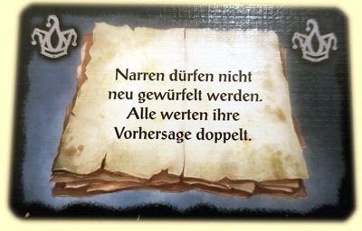 Liegen nach einem Wurf Narren offen aus, darf man eine Narrenwertung machen. Dann gibt's keine Minuspunkte, sondern man trägt eine Null ein. Jede Anzahl von Narrenwürfeln darf man aber nur ein Mal im Spiel benutzen - hat man sich also mit zwei ausliegenden Narren auf null Punkte gerettet, darf man das nächste Mal, wenn zwei ausliegen, diese nicht mehr benutzen. Sobald jemand 9 (oder in der Profi Variante 12) Kreuze gemacht hat, endet das Spiel, und wer die höchste Punktzahl hat, konnte am besten in die Zukunft schauen.