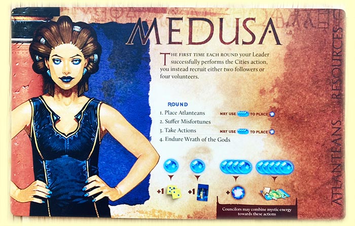 Nachdem die Unglückskarten gezogen wurden (und bevor alle anderen Effekte wie z. B. der Astrologe eintreten), wandert die Medusa. Dazu wird an jede Halbinsel eine Zahl vergeben (1 - 6) und gewürfelt, danach erhalten alle Inselteile eine Zahl von 1 bis 6, so dass nach zweimal Würfeln klar ist, wohin sich die Medusa bewegt (für geflutete wie bereits vollständig mit versteinerten Atlantern besetze Inselteile wird neu gewürfelt). Alle Atlanter auf diesem Inselteil werden dann sofort versteinert und blockieren die Felder. Sollten diese untergehen, ertrinken sie und werden dauerhaft aus dem Spiel entfernt. Sollten sich keine Altanter auf dem Inselteil befinden, werden stattdessen so viele Freiwilllige versteinert, wie es Aktionsplätze gibt.