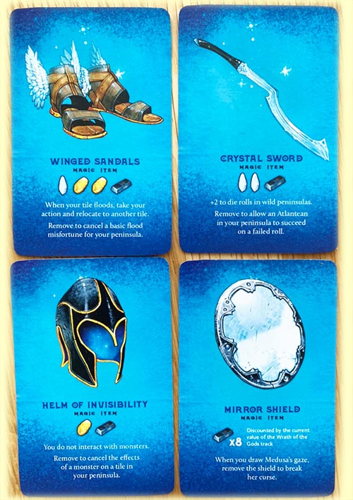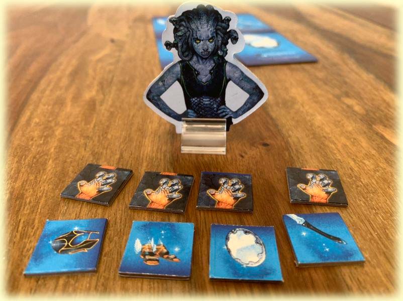 Im Spiel wird mit der Medusa ein psychologischer Mechanismus eingebaut: Lasse ich einen meiner Atlanter oder sogar mehrere versteinern, um andere zu retten, da die zufällige Bewegung der Medusa für die Gruppe ein noch größeres Problem darstellt und uns evtl. den Sieg kosten könnte? Durch die zufällige Bewegung der Medusa erhöht sich die Spannung jede Runde und trifft damit spielerisch einen Reiz, der mir besonders gut gefällt. Die Flucht von einer verlorenen Insel, auf der mich ein unberechenbares Monster immer und überall angreifen kann. Mich hat das sofort an das Ziehen der schwarzen Karten in Schatten über Camelot, die Infektionskarten bei Pandemie oder den Start einer neuen Runde bei Winter der Toten erinnert. Die bange Frage, wo das Unglück als nächstes einschlägt: einfaches ein schönes Spielgefühl.