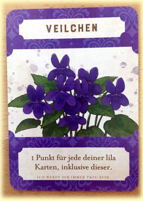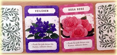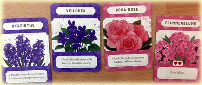Wir haben 18 Blumenkarten, die unterschiedliche Eigenschaften aufweisen: eine Farbe, eventuell ein oder zwei Herzen und eine Wertungsregel bzw. gelegentlich eine Aktion.
