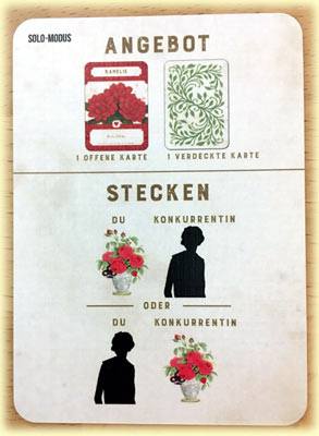 Ein Spieler zieht 2 Karten vom Blumenkartenstapel, sieht sie sich an und bietet dem Mitspieler eine davon offen, die andere verdeckt an.