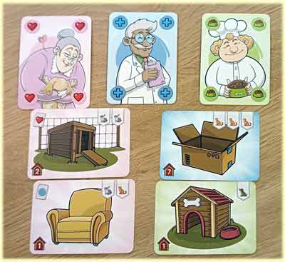 Hinzu kommen 3 verschiedene Hilfskarten, auf denen Helfer*innen abgebildet sind, die Fressen, Zuneigung oder Pflege schenken. Und schließlich gibt es Ortskarten, die Sofa, Hütte, Körbchen oder ähnliches zeigen. Die Ortskarten sind folgendermaßen aufgebaut: