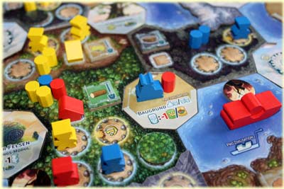 Mit "Abbau" setzen wir in von uns besetzten Gebieten Rohstoffmarker ein, die wir mit der Aktion "Transport" auf die passenden Felder unseres Depots bringen können. "Entdeckung" erlaubt uns, alle bis jetzt unentdeckten Orte um ein von uns besetztes Gebiet aufzudecken, was uns nebenbei sofort ein paar Siegpunkte liefert. "Verpflegung" schließlich ist notwendig, um unsere Stämme ausreichend zu ernähren. Mit der Aktion "Bauwerk" können wir Bauvorhaben, wie Farmen, Boote, Statuen und Siedlungen durchführen, die unseren Stämmen unterschiedliche Vorteile bringen.