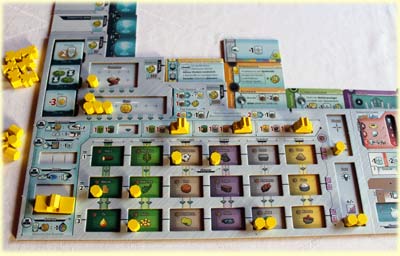 Ich kenne beispielsweise fast kein Spiel, bei dem 18 unterschiedliche Rohstoffe vorkommen. Jede der sechs Geländeformen produziert eine von drei verschiedenen Ressourcen. So können wir in einem Waldgebiet entweder Holz, Wachs oder Öl finden. Benötigen wir einen bestimmten Rohstoff, müssen wir oft erst herausfinden, wo wir diesen überhaupt auftreiben können. In diesem Zusammenhang interessant, dass nicht 18 unterschiedliche Rohstoff-Plättchen vorkommen, wie dies so häufig der Fall ist, sondern einheitliche Marker verwendet werden. Die Position eines Markers in unserem Depot gibt ab, um welche Ressource es sich handelt.