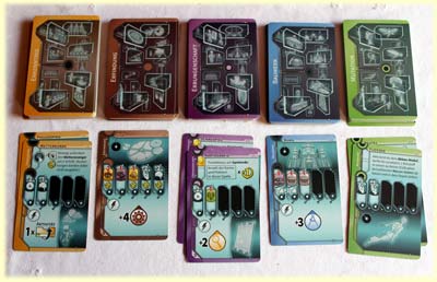 Ein eigenes Kapitel sind die Forschungskarten, die wir mit den entsprechenden Aktionen (je nach Art der Karte eine Kombination aus einer "6" mit einer anderen Würfelzahl) ausspielen können. Aber nur, wenn wir gleichzeitig die Bedingungen der Karte (bestimmte Rohstoffe abgeben, gewisse Eigenschaften besitzen, u. ä.) erfüllen, dürfen wir eine Forschungskarte tatsächlich in unsere Konsole einbauen, wo sie uns fortan positive Effekte bringt. Es ist aber wichtig, dass in jeder Spalte unserer Konsole nur Forschungskarten einer Art (Errungenschaft, Bauwerk, Erkenntnis, Mutation oder Erfindung) sein dürfen.