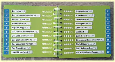 Ein weiterer Unterschied zur Erwachsenen-Version ist die Darstellungsform der Fälle. Gibt es in MicroMacro – Crime City für jeden Fall ein loses Kartenpäckchen, liegt der Kindervariante ein Ringbuch, das sogenannte Ermittlerbuch bei, was uns deutlich besser gefällt. Alle Fälle sind kompakt beieinander, es können keine Karten verrutschen oder durcheinandergeraten und durch das größere Format haben Text und Bilder wesentlich mehr Platz, was für mehr Übersicht sorgt. Dem Inhaltsverzeichnis am Anfang des Buches lässt sich auf den ersten Blick entnehmen, welcher Fall sich hinter welcher Nummer verbirgt und die Sterne zeigen an, wie schwer das jeweilige Rätsel ist, sodass man je nach Laune entscheiden kann, welchen Fall man als nächstes Lösen möchte.