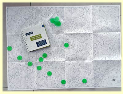Das Spielmaterial selbst besteht aus einem großen Stadtplan, einem Ermittlerbuch und 20 durchsichtigen grünen Detektiv-Markern. Gerade letztere sind ziemlich praktisch und ein weiterer Unterschied zur Erwachsenen-Variante, in der kein extra Material zum Markieren von Orten vorhanden ist. Der Stadtplan selbst ist aus glattem Papier und sollte schon vorsichtig behandelt werden, da er gerade in den Knicken relativ empfindlich ist und schnell einreißt, gerade wenn man sich beim Ermitteln und Suchen über ihn beugt und eventuell Ellenbogen oder Händen auch mal aufliegen.