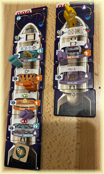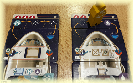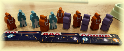 In den folgenden Runden rücke ich zu Beginn meines Zuges meinen Arbeiter immer eine Position auf der Weltraumreise weiter. Je nach Station (Freier Weltraum oder Planet) erhalte ich unterschiedliche Boni, bis nach frühestens drei Runden die Reise abgeschlossen ist und mein Arbeiter wieder zurück kommt.