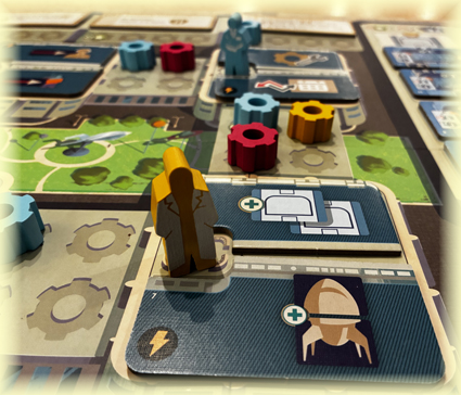 Was darf auch nicht fehlen auf so einem Weltraumflug? Richtig: Sauerstoff, Treibstoff und etwas Essen. Dies einzusammeln ist die perfekte Aktion für meinen zweiten Arbeiter. Ist alles grundsätzlich kostenlos zu haben, wenn denn noch genügend Vorrat davon vorhanden ist (böse Mitspieler). Sonst muss ich die andere meiner zwei Aktionen zuerst nutzen, um wenigstens einen Vorrat wieder aufzufüllen, was mir aber immerhin etwas Geld gibt.