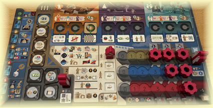 Und auch die Arbeiter können Boni auslösen, nämlich wenn sie rausgeschmissen werden. Die Aktionsfelder auf dem Spielplan sind nämlich nie blockiert, sondern nur besetzt. Steht mir ein anderer Arbeiter im Weg, darf ich ihn an seinen Spieler zurückgeben, der darf sich einen Bonus aussuchen und ich kann das Feld nutzen. Besagte MitspielerIn ist über diesen Zug sogar doppelt erfreut, weil nun hat er (oder sie) wieder einen freien Arbeiter, für die nächste Aktion.